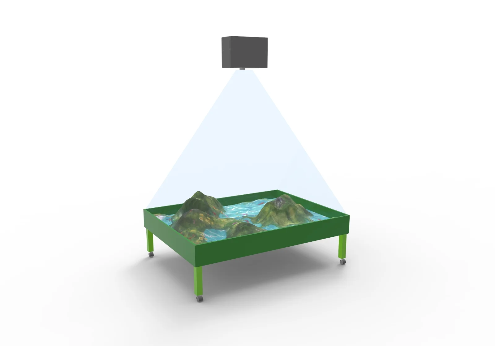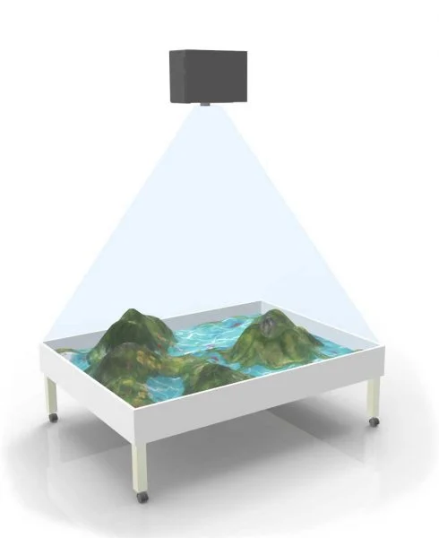 На поверхность песочницы проецируется природный ландшафт. Изменяя высоту холмов или глубину ямок и перемещая песок, дети могут наблюдать, как песочница реагирует, создавая новые горы, вулканы, озера и реки. Ландшафт оживает благодаря анимациям с животными, которые можно наблюдать с высоты птичьего полета. Мир песочницы насыщен звуками и событиями: извержения вулканов, изменение русла рек, пролетающие стаи птиц. Несколько детей могут играть одновременно, изучая строение планеты, развивая навыки ориентации в пространстве, памяти и логики.
