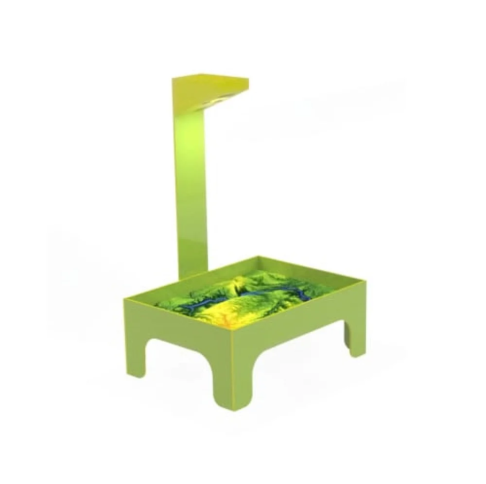 Интерактивная песочница обладает простой и безопасной конструкцией. Сенсорный датчик определяет расстояние до поверхности песка и передает сигнал компьютеру, чтобы окрасить каждый участок в соответствующий цвет. Это создает на песке эффект островов, долин, рек, вулканов и даже динозавров.
