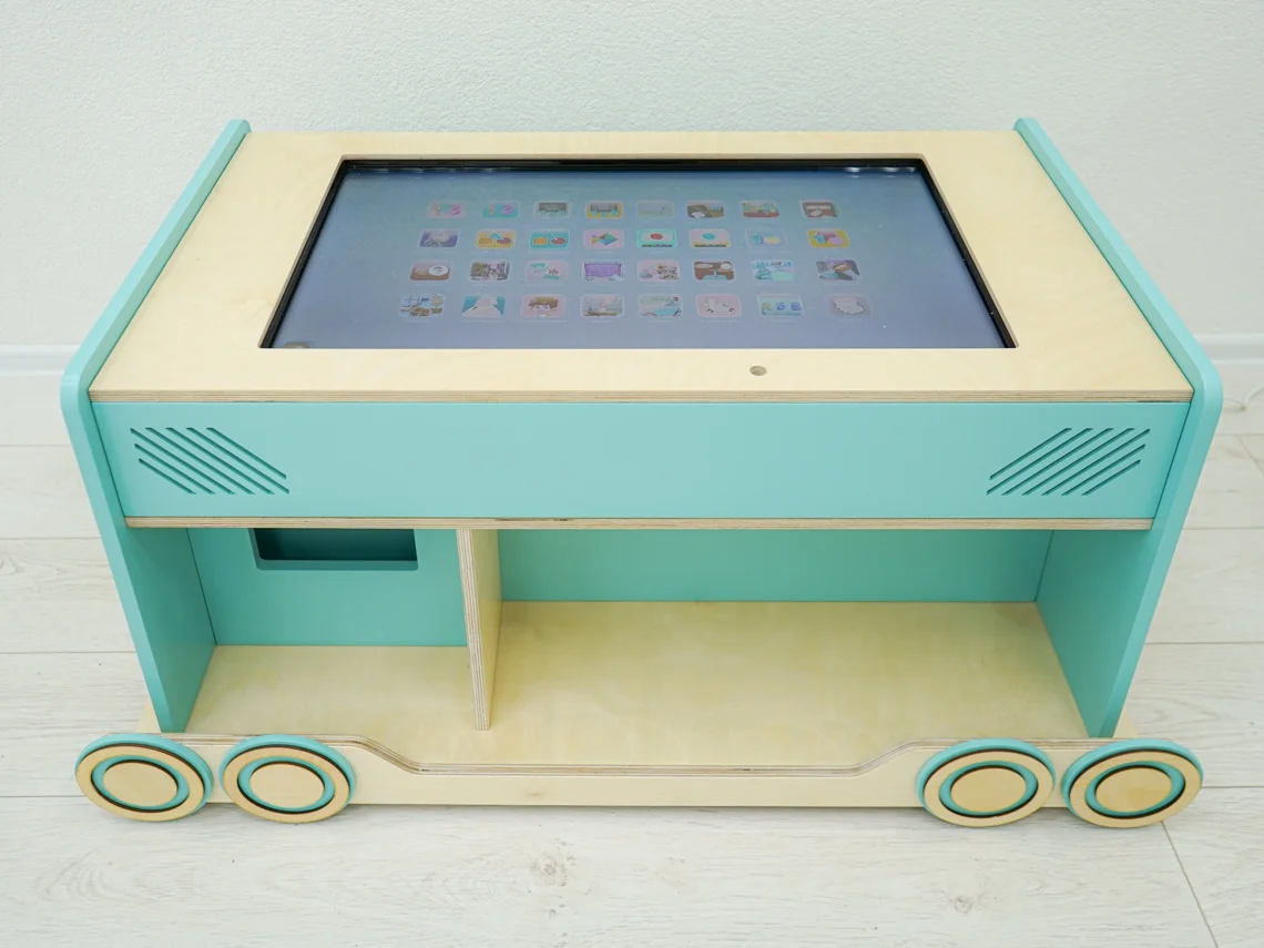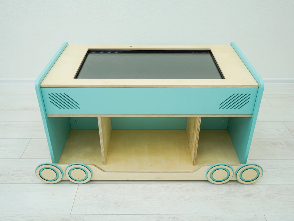 Представляем вашему вниманию интерактивный стол, специально разработанный для размещения в группах детских садов. Дизайн стола выполнен в форме вагона паровоза, что делает его привлекательным и интересным для детей.