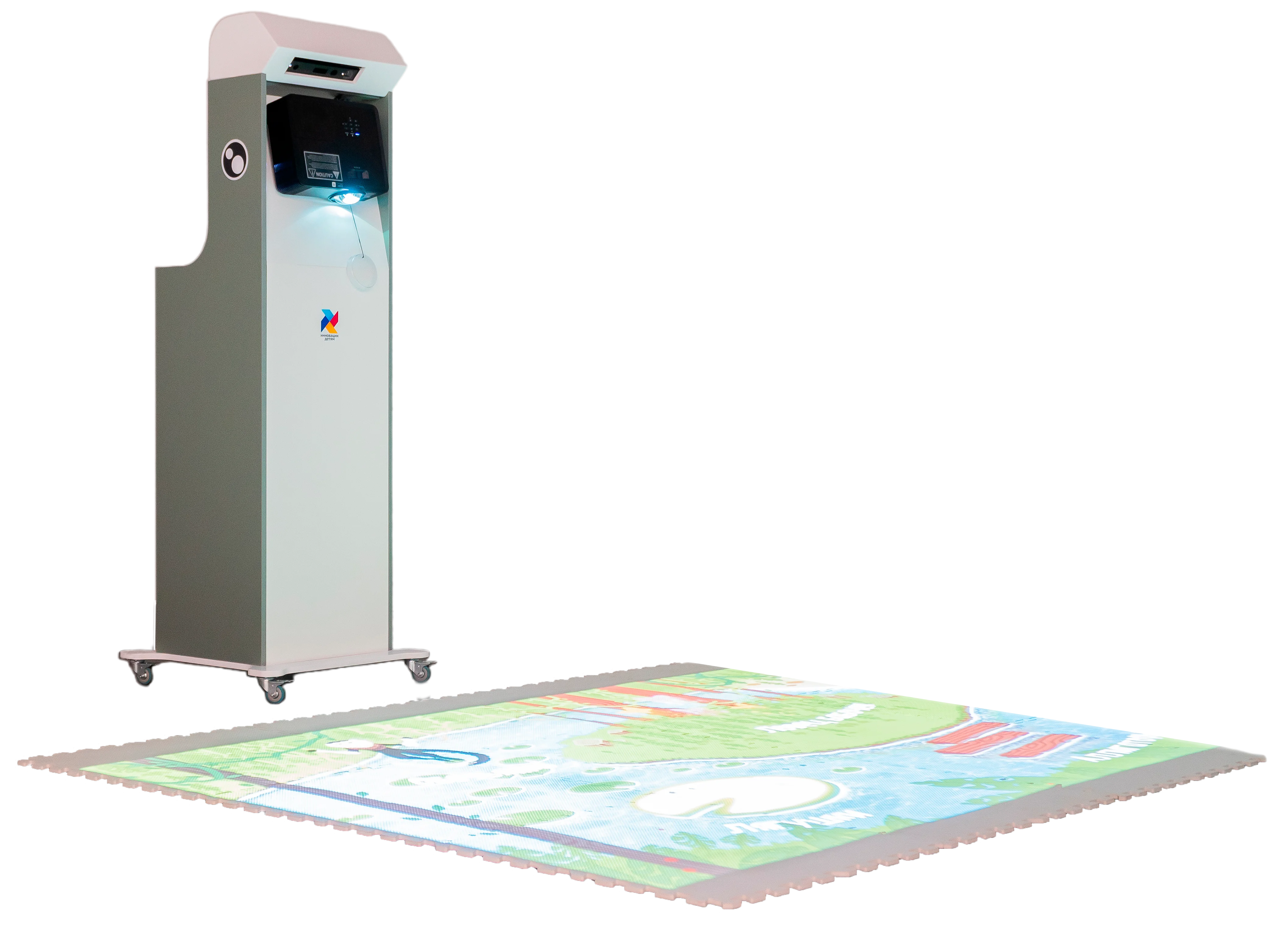 Интерактивный пол Innovatic – это мобильный комплекс для игровых и образовательных занятий. Оснащённая проектором, датчиком движения и системным блоком тумба с колёсиками позволяет легко перемещать систему, а специальное программное обеспечение превращает пол в интерактивное пространство.