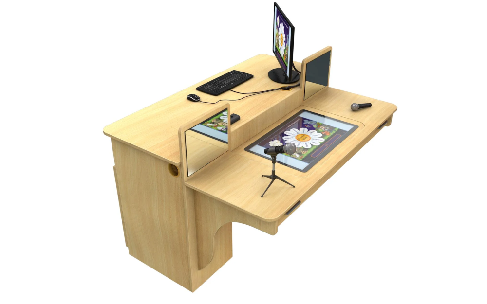 - Рабочее место для двух учеников. Оснащается двумя радиомикрофонами, двумя зеркалами для отработки логопедических упражнений. Также в модуле предусмотрен сенсорный монитор диагональю 25”, оснащенный двумя подъемными механизмами с газовыми пружинами и гидравлическими амортизаторами.