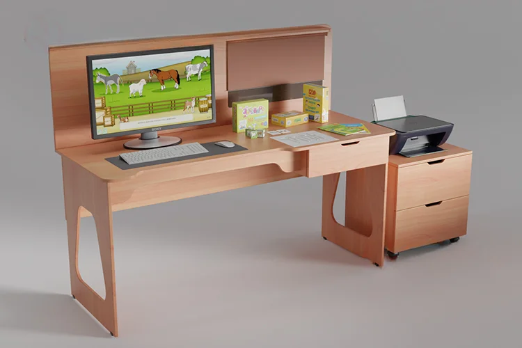 Корпус стола изготовлен из экологически безопасных материалов, не имеет шероховатостей, острых краев и деталей, которые могут стать причиной травмы. Изготовлен в виде классической корпусной мебели, состоящей из двух предметов: компьютерный стол и тумбочка для хранения дидактических материалов. На рабочей поверхности стола установлен монитор, зеркало для артикуляционной гимнастики с подсветкой и шторкой, 2 микрофона, беспроводная клавиатура и мышь. На тумбочке можно установить МФУ.